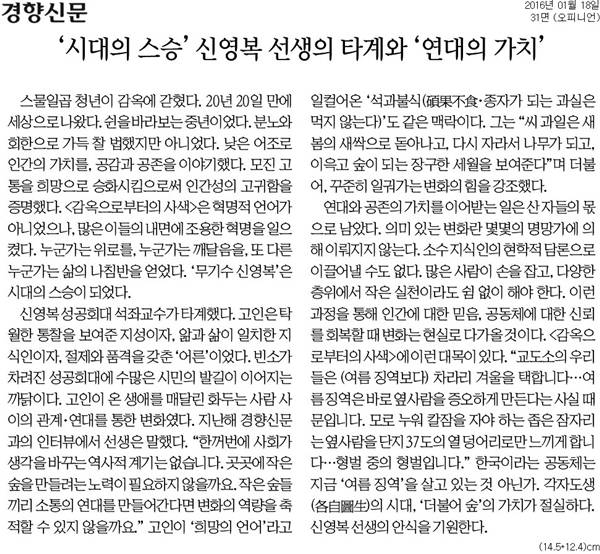경향은 사설 <‘시대의 스승’ 신영복 선생의 타계와 ‘연대의 가치’>에서 “고인은 탁월한 통찰력을 보여준 지성이자, 앎과 삶이 일치한 지식인이자, 절제와 품격을 갖춘 ‘어른’이었다”고 추모했다.