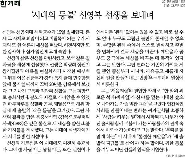 한겨레는 사설 <‘시대의 등불’ 신영복 선생을 보내며>에서 “선생은 박정희 정권이 장기집권의 야욕을 현실화하기 시작한 때부터 그 뒤를 이은 신군부가 강압 통치 끝에 민주항쟁 앞에 물러설 때까지 꼬박 20년을 감옥에서 보냈다. 그 기나긴 고통과 억압의 생활을 그는 희망으로 승화시켰다. 분노와 좌절로 가라앉을 수 있었던 하루하루를 성찰과 공부, 깨달음으로 채워 마침내 새 출발의 ‘작은 등불’을 그려냈다”고 평가했다.