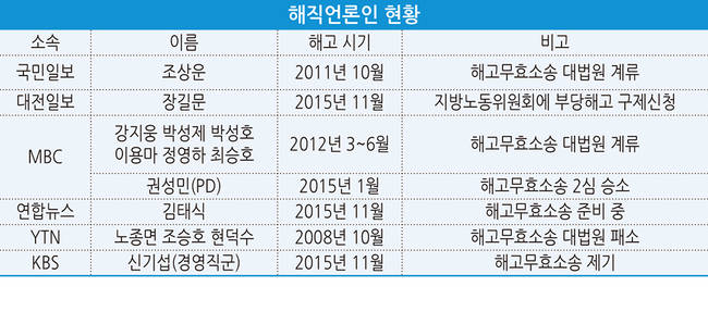 주로 방송사에서 있었던 언론인 해직사태는 지난해부터 지역신문과 연합뉴스 등으로 확산되고 있다. 대전일보는 15년차 사진기자인 장길문 노조위원장을 지난해 11월 해고했다. 장 기자는 1년 동안 대기발령, 비편집국 전출, 타지역 전보 발령 등 징계성 인사와 검찰 고소까지 당한 끝에 내쫓겼다. 장 기자는 “사측이 무늬만 다른 ‘분풀이 징계’를 내릴 때마다 노동위원회와 법원 등은 부당노동행위로 판결했다”며 “해고무효 확인을 위해 지노위에 부당해고 구제신청을 냈다”고 말했다. 연합뉴스도 지난해 11월 문화재 전문기자였던 23년차 김태식 기자를 해고했다. 김 기자가 “부당한 목적으로 가족 돌봄 휴직을 신청했고 부적절한 언행을 했으며 업무시간에 페이스북을 하는 등 근무태도가 불량했다” 등이 사유였지만 내부 구성원들조차 고개를 갸우뚱거리게 하는 해고였다.