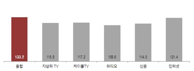 매체별로 보면 지상파TV 115.9, 케이블TV 117.3, 라디오 109.6, 신문 114.0, 인터넷 131.4 로 전달에 비해 상승할 것으로 보인다.