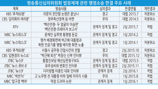 이에 법원에서 방심위의 결정이 뒤집히는 면구스러운 상황도 적지 않게 나오고 있다. 방심위 한 관계자는 “전체적으로 보면 (방심위와 방송사가 승소하는 경우가) 5대5 정도”라며 “시사·보도 프로그램만으로 압축하면 (심의 행태가) 더 분명히 드러날 것”이라고 말했다. 이와 관련 언론계의 큰 관심을 모아온 ‘의문의 천안함, 논쟁은 끝났나’편의 KBS ‘추적 60분’, 정부축산정책 등을 비판한 CBS ‘김미화의 여러분’, 박창신 신부를 인터뷰한 CBS ‘김현정의 뉴스쇼’ 모두 대법원에서 방송사의 승소로 확정판결이 난 바 있다.