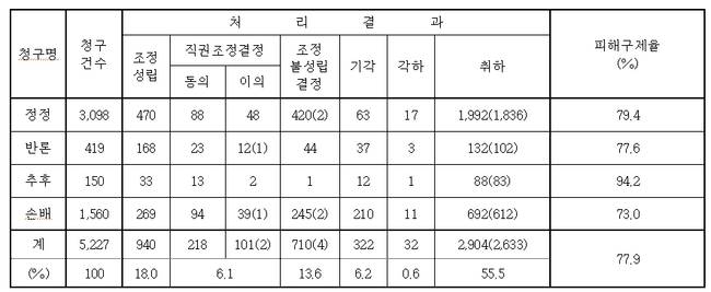 한편 처리 현황을 보면 전체 5227건 중 취하 2904건(55.5%), 조정성립 940건(18.0%), 조정불성립결정 710건(13.6%), 직권조정결정 319건(6.1%), 기각 322건(6.2%), 각하 32건(0.6%) 등의 순으로 나타났다.