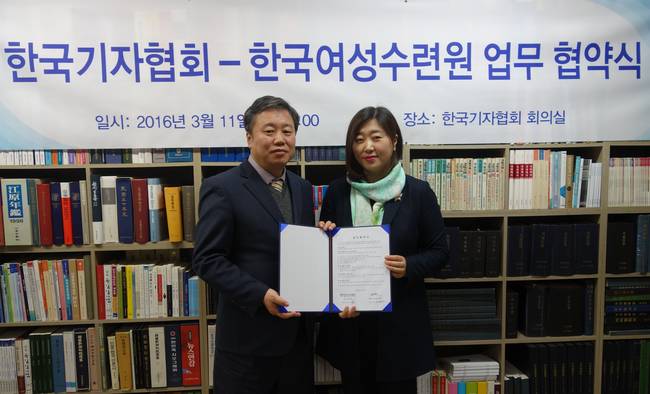 한국기자협회(회장 정규성)와 (재)한국여성수련원(원장 전예현)이 11일 서울 중구 프레스센터 한국기자협회 회의실에서 상호 협력을 강화하는 업무협약을 체결했다.