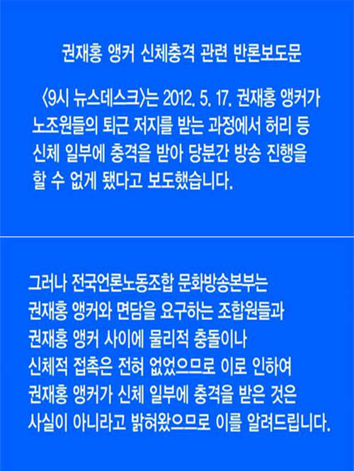 MBC '8뉴스'는 이날 첫머리에서 '권재홍 앵커 신체충격 관련 반론보도문'을 방송했다. MBC는 '반론보도문'을 통해 “2012. 5. 17. 권재홍 앵커가 노조원들의 퇴근 저지를 받는 과정에서 허리 등 신체 일부에 충격을 받아 당분간 방송 진행을 할 수 없게 됐다고 보도했다”며 “그러나 MBC본부는 권재홍 앵커와 면담을 요구하는 조합원들과 권재홍 앵커 사이에 물리적 충돌이나 신체적 접촉은 전혀 없었으므로 이로 인하여 권재홍 앵커가 신체 일부에 충격을 받은 것은 사실이 아니라고 밝혀왔으므로 이를 알려드린다”고 전했다.