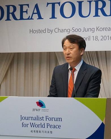 정창수 한국관광공사 사장은 18일 서울 프레지던트호텔에서 열린 '세계평화기자포럼' 참석자 만찬 간담회에서 “세계 언론인 여러분이 한반도의 분단을 상징하는 DMZ를 방문해 평화의 중요성을 느끼고, 한국의 유산으로 가득한 지역 곳곳에서 즐거운 시간을 보내길 바란다”고 말했다.