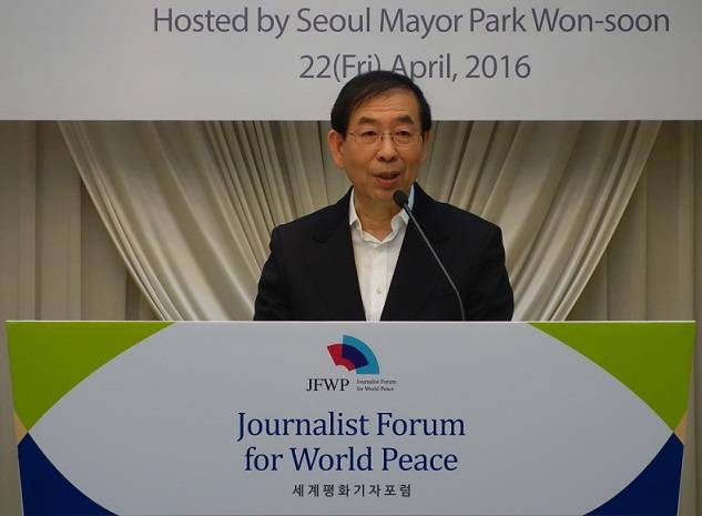 박원순 서울시장은 '2016 세계평화기자포럼' 마지막 날인 22일 환송 만찬에서 "평화를 지키는 데 펜보다 강한 무기는 없다"며 "세계 기자 여러분이 한반도 비핵화와 평화의 전도사로 활약한다면 갈등과 대립, 불안과 염려, 근심과 절망에 마침표가 찍히고 평화의 새 시대가 열릴 것"이라고 밝혔다.