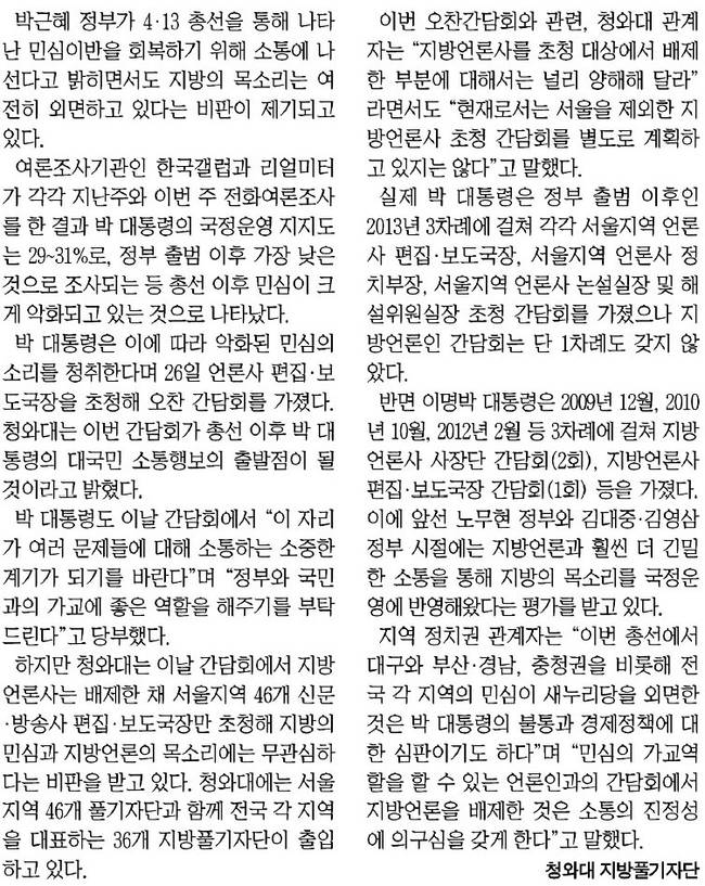 박근혜 대통령이 46개 언론사 편집·보도국장과 간담회를 가진 다음날인 지난달 27일 전국 30여 개 지역일간지에 “박근혜 정부가 지방과의 소통을 외면하고 있다”는 내용의 기사가 ‘청와대 지방풀기자단’ 바이라인으로 일제히 실렸다.