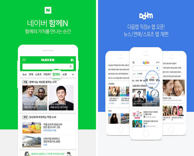실제 네이버 모바일앱은 뉴스, 연예, 스포츠, 웹툰·뿜, 차·테크 등에 이어 최근 블로그 포스트 카페 등을 모은 ‘MY피드’와 ‘함께N’을 메인 메뉴판에서 제공하고 있다.