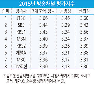 JTBC가 지상파와 종편 등 8개 채널을 대상으로 한 2015년 ‘방송채널 평가지수 조사’에서 1위를 차지했다. SBS와 KBS 1TV가 각각 흥미성과 공익성 등 분야에서 강세를 보이며 2, 3위를 기록한 가운데 공영방송 MBC는 이번 조사에서 최하위권을 차지했다.