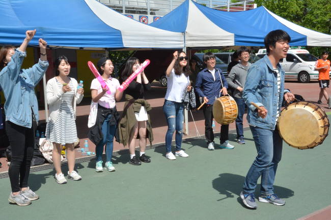 제44회 한국기자협회 서울지역 축구대회 이튿날인 8일 고양 어울림누리 별무리구장에서 열린 16강전. 강렬한 햇볕만큼 응원 열기도 뜨거웠다. 응원단은 북, 장구, 꽹과리, 응원 나팔 등을 동원해 목청껏 응원했다.