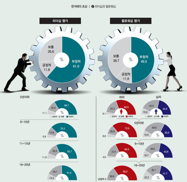 ‘팔로워십’에 대한 비판적 평가 역시 두드러졌다. ‘긍정적’ 평가는 11.8%에 불과했고, ‘부정적’ 의견은 49.5%를 기록했다. 구성원 스스로 조직에서 제 역할을 하지 못하고 있다고 판단한 것으로 보인다. 이 결과 역시 근무 연한 5년 이하, 30대 이하 연령 그룹에서 가장 부정적인 결과가 나왔다.