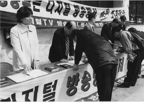 '디지털TV 방송방식 변경을 위한 소비자운동’이 지난 19일 발족 기자회견을 갖고 정보통신부가 결정한 미국방식을 유럽방식으로 변경할 것을 요구하며 본격적인 소비자 운동을 선포했다. 이들은 기자회견을 마친 뒤 시민들을 상대로 미국방식의 문제점을 알리는 서명운동을 벌였다. DTV 소비자운동에는 참여연대, YMCA, 여성단체연합, 한국노총 등 40여개 시민사회단체가 참여하고 있다.