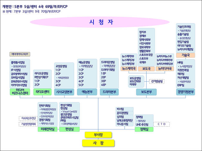 이번 조직개편의 핵심 중 한 축은 ‘보도국의 3국 체제 분할’이다. 기존 보도본부(본부장 서두원) 보도국이 보도국(국장 양윤석), 뉴스제작국(국장 김성준), 뉴미디어국(국장 심석태) 등 3국 체제로 전환되며 기능을 나눠 갖게 됐다. 보도국이 취재를 담당하면, 뉴스제작국은 뉴스 아이템 선택과 제작을 책임진다. 기존 보도국 산하 뉴미디어실은 ‘국’으로 격상됐다. 이는 ‘메인뉴스’ 중심으로 돌아가는 현 보도시스템을 개선하는 기본틀을 제도 차원에서 마련한 것이기도 하다.