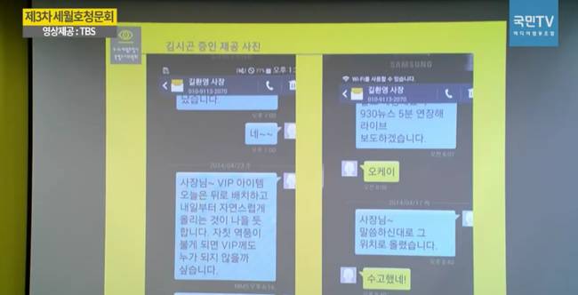 이와 관련해 공개된 문자에서 김 전 국장은 “사장님~ VIP 아이템 오늘은 뒤로 배치하고 내일부터 자연스럽게 올리는 것이 나을 듯합니다. 자칫 역풍이 불게 되면 VIP께도 누가 되지 않을까 싶습니다”라고 했다. 김 전 국장은 이에 대해서는 “(앞선 리포트들이 세월호를 집중적으로 다룬 만큼) 흐름상 맞지도 않고 세월호와 관련이 없어 올리면 문제가 있을 것 같아 (사장에게) ‘대통령한테 누가 된다’고 하면 말을 잘 듣기 때문에, 원래대로 31번째 보도를 하기 위해 문자를 보내 관철시켰던 내용”이라고 부연했다.