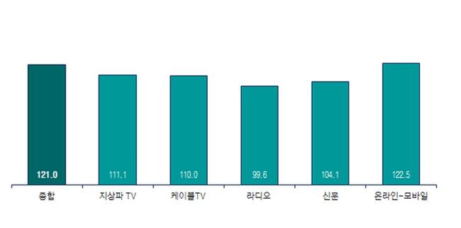 매체별로는 지상파TV 111.1, 케이블TV 110.0, 라디오 99.6, 신문 104.1, 온라인-모바일 122.5로 집계됐다.