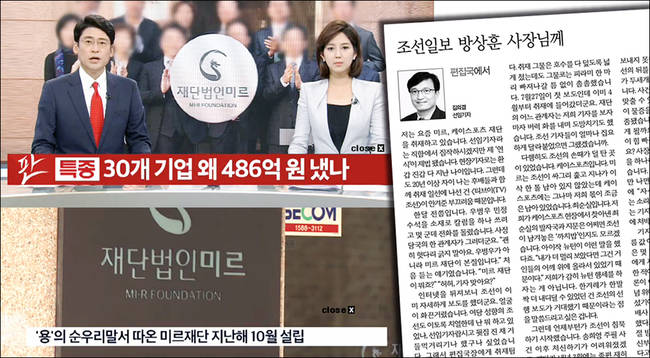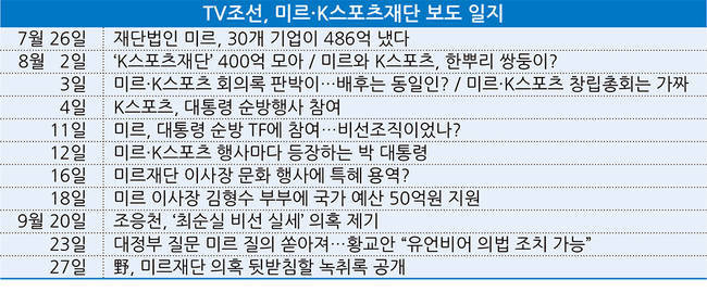 미르·K스포츠재단의 실체를 처음 폭로한 곳은 TV조선이었다. TV조선은 지난 7월26일 재단과 대기업 관계자들의 발언을 토대로 미르재단이 두 달 만에 486억원을 모았고 여기에 안종범 청와대 정책조정수석이 개입한 정황이 있다고 보도했다.