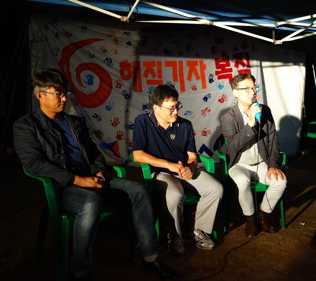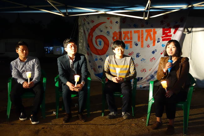 기자협회보는 지난 7일 밤 서울 상암동 난지캠핑장에서 열린 <YTN 해직 8년> 행사장을 찾았다. 비가 보슬보슬 내리는 밤 아래 8년 전 해고된 기자들과 60여명의 YTN 선후배들이 한자리에 모였다. 이들은 하나같이 “올해가 마지막 행사이기를 바란다”는 간절한 마음을 전했다.