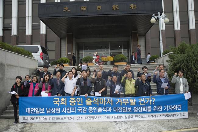 공대위는 11일 대전일보 사옥 앞에서 기자회견을 열고 "대전일보 노조탄압의 실상을 국회법에 따라 국민 앞에 밝혀야 한다"며 "남 사장은 국회 환노위 국감 증인 출석에 나서야 한다"고 요구했다.