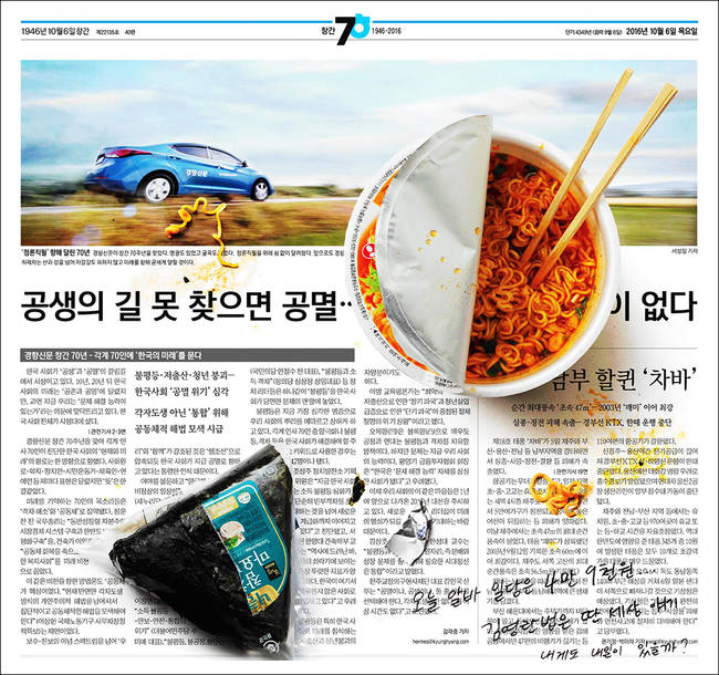 경향신문이 창간 70주년을 맞아 1면에 올려놓은 컵라면과 삼각 김밥은 많은 이들에게 회자됐다. ‘신문의 얼굴’을 어지럽힌 면발과 라면 국물, 삼각 김밥 부스러기, 한 귀퉁이에 끼적인 메모에서 어떤 이들은 종이신문 위상의 하락을, 어떤 이들은 이 시대 고달픈 청년의 모습을 느꼈기 때문이다.