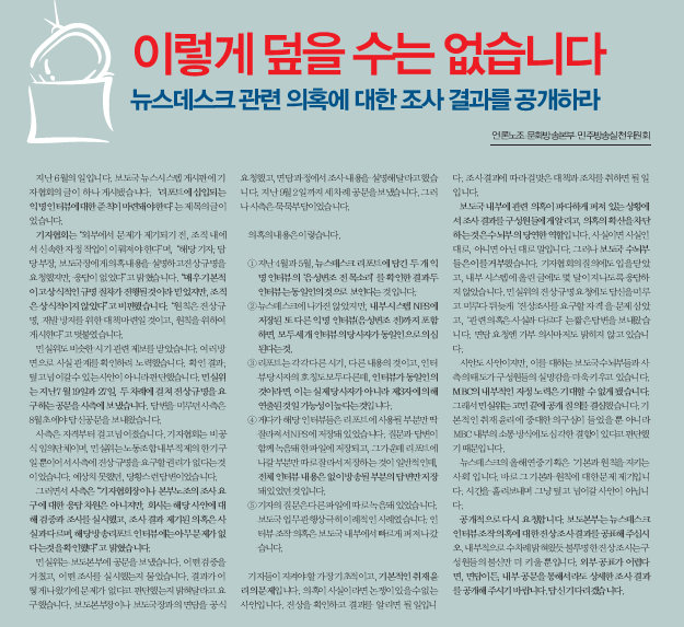 그러면서 “보도국의 최소한의 윤리, 최소한의 자정 능력은 버리지 말자는 호소에 대해 최소한의 소통 구조마저 걷어차 버리는 보도본부 수뇌부에게 뉴스를 만들 자격, 시청자들에게 뉴스를 전달할 자격이 과연 있다고 할 수 있는가”라고 꼬집었다.