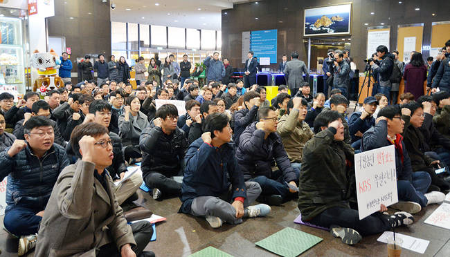 언론노조 KBS본부(본부장 성재호)는 1일 서울 여의도 KBS신관 로비에서 ‘최순실 보도 참사와 인사제도 개악 규탄 결의대회’를 열고 국정농단 사태에 침묵하고 외면한 보도책임자 사퇴를 촉구했다. 정국을 뒤흔든 ‘최순실 게이트’ 국면에서 미진했던 KBS 보도에 대한 질책의 자리다.