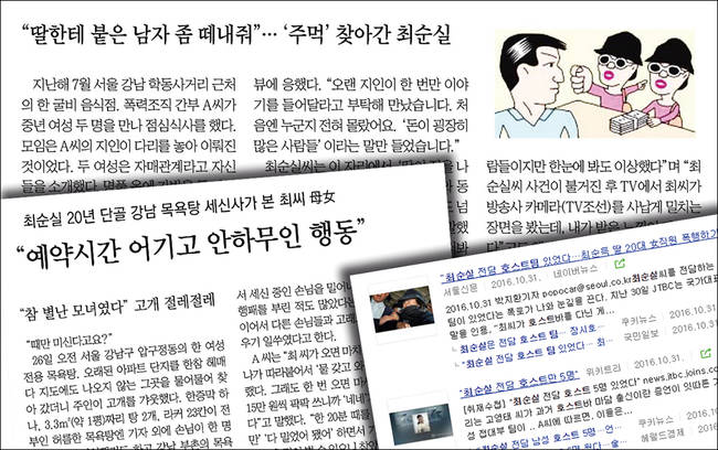 최씨의 일거수일투족도 단연 화제였다. 종교적인 문제부터 시작해 함께 사업에 참여해온 고영태 더블루K 이사와 내연관계라는 추측성 보도가 난무했고, 아예 최순실 전담 호스트팀이 있었다는 기사가 400건 넘게 온라인에 쏟아졌다. 동아일보도 지난달 27일 ‘최순실 20년 단골 강남 목욕탕 세신사가 본 최씨 모녀’라는 기사를 통해 ‘돈은 많지만 무례하고 상스러운’ 최씨와 딸 정유라씨의 모습을 적나라하게 전했고, 조선일보는 8일 딸의 남자 친구를 떼어내 달라며 조폭에게 의뢰한 최씨의 기행을 지면으로 보도하기도 했다.