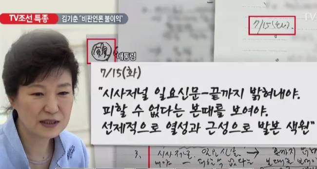 TV조선은 특히 "박 대통령 역시 "시사저널 일요신문-끝까지 밝혀내야. 본때를 보여야. 열성과 근성으로 발본 색원"하라는 주문을 합니다"라며 "대통령을 비판한 사설에 대해 '논조 이상-이모 논설주간'을 표시해 두기도 했다"고 전했다.