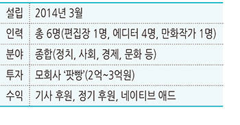 미디어스타트업 ‘직썰’은 창업 한 달 만에 국내외 언론사들의 관심을 받으며 급격히 성장했다. 당시 페이스북 좋아요 100여명에 불과했던 직썰은 경향과 한겨레 등 진보 언론이 잇따라 만화를 소개하며 입소문을 타기 시작, 현재 14만4000여명을 넘어선 상태다. 정주식 직썰 편집장은 “모회사인 팟빵이 초기자금 2억~3억원을 후원해준 돈으로 창업해 네이티브애드와 후원 등으로 수익을 내고 있다”며 “정기후원은 한 달에 200명 정도 꾸준히 들어오고 있고, 기사후원의 경우에는 월 100만원에서 500만원까지 천차만별이다. 올 연말에는 손익분기점을 맞출 수 있을 것으로 기대하고 있다”고 설명했다.