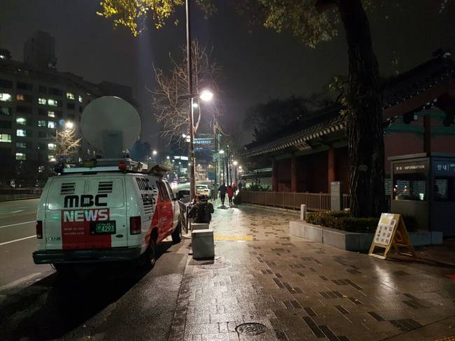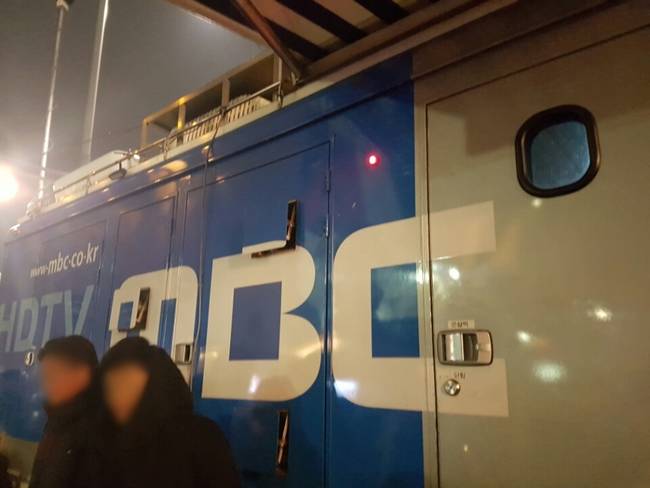 11월 26일 저녁 7시 54분 세종문화회관 앞. 8시 뉴스데스크의 톱뉴스로 연결하는 광화문 촛불집회 생중계를 앞둔 MBC 중계차량에 다가갔다. 차량 주변을 건장한 사내 5명이 지키고 서 있었다. 소속을 물으니 MBC의 요청으로 배치된 사설 경호업체 직원들이라고 했다. 모두 14명이 현장에 나왔다고 했다. 그들의 임무는 중계차량과 부감 화면을 촬영하는 지미 짚 카메라를 ‘보호’하는 것이었다. 그렇지 않아도 근처에 있던 OBS, 채널A, SBS, KBS, tbs 중계차와는 달리 MBC 중계차 전면에는 각종 손 팻말이 어지럽게 붙어 있었다.