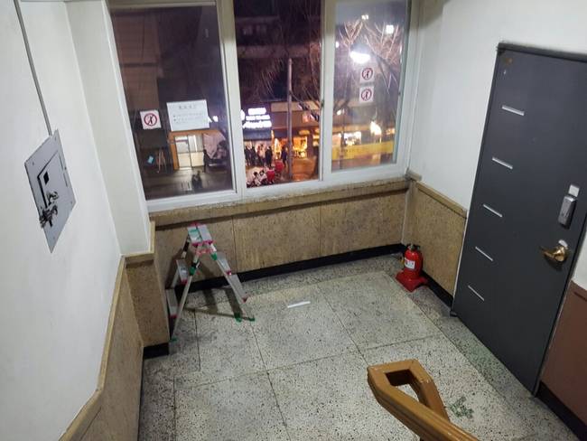중계팀이 철수할 때까지 기다렸다가 밤 11시쯤 생방송을 했던 건물에 들어가 봤다. 방송을 했던 곳은 사무실 내부도 아니고 상가 건물의 계단으로 쓰는 복도였다. 생중계할 때 기자가 서 있어야 할 위치를 표시하는 테이프도 바닥에 그대로 붙어 있었다. 복도 창문을 열어놓고 뒤로 보이는 인파를 배경 화면으로 잡았던 것이다. 두 발짝 밖에 되지 않는 좁은 공간에서 카메라를 세워놓고 기자가 마이크를 들었다는 얘기다. 기자의 자리에 내가 서보니, 눈앞에는 공용 화장실 문이 들어왔다.