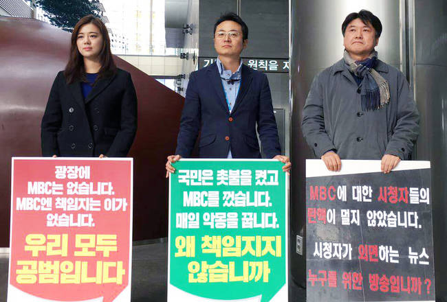 KBS노동조합과 언론노조 KBS본부 등 양대 노조 조합원들은 지난 8일 2년7개월 만에 총파업에 나서며 거리로 뛰쳐나왔다. KBS 구성원 중 3782명이 총파업에 들어가며 요구한 사항은 공영방송 위상추락에 따른 사장의 대국민 사과와 보도 및 방송책임자 문책, 정권의 공영방송 장악 진상규명 및 지배구조 개선을 위한 방송법 개정 쟁취, 일방적 임금삭감 등 독선경영 철회였다. MBC 기자들 역시 지난 7일부터 릴레이 피케팅을 이어가며 보도본부장과 보도국장의 퇴진을 요구하고 있다. 그간 ‘박근혜-최순실 게이트’와 관련한 보도가 묵인·축소되고 촛불집회 현장에서 취재진이 시민들의 반발로 쫓겨나거나 방송사 로고를 가리고 리포트를 하던 중 지난 8일 ‘뉴스데스크’ 시청률(tnms자료)은 2%대까지 떨어졌다.