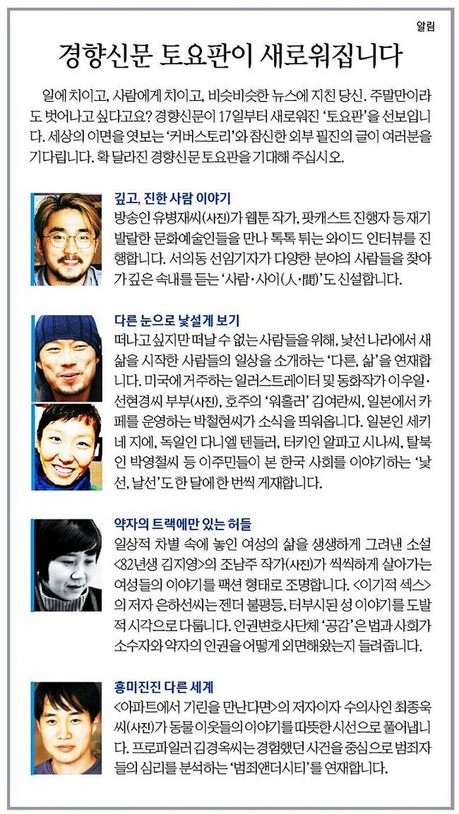 경향신문은 토요판에 커버스토리를 포함한 다양한 외부 필진들의 글을 실을 예정이다. 방송인 유병재씨가 웹툰 작가, 팟캐스트 진행자 등 재기발랄한 문화예술인들을 만나 와이드 인터뷰를 진행하고, 서의동 선임기자가 다양한 분야의 사람들을 찾아가 깊은 속내를 듣는 ‘사람·사이(人·間)’ 코너도 신설한다.