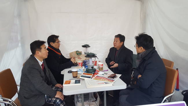 정규성 한국기자협회장이 15일 MBC 앞에서 천막 농성 중인 박성호 MBC 해직기자와 김희웅 MBC기자협회장 등 언론노조 MBC본부 조합원들을 만나 해직기자 구제를 위한 법안 마련의 필요성을 강조했다.