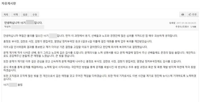 처음 문제 제기에 나섰던 B기자의 15기 동기들도 이날 "선배들께 심려를 끼쳐 드려 죄송하다"며 "그래도 모두의 격려 속에 저희가 성명을 통해 요구한 모든 사안이 수용됐다. 조금씩 상처가 아물고 그 자리에 새살이 돋아날 것"이라고 설명했다.
