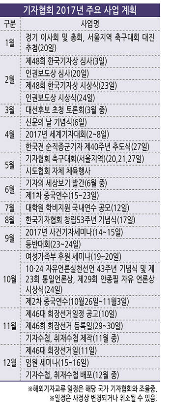 기자협회는 2017년 주요 업무계획을 확정했다. 2월23일 한국기자상 시상식에 이어 세계기자대회를 4월2~8일 개최한다. 기자협회는 2013년부터 매년 세계기자대회를 개최하고 있으며 지난해 ‘한반도 비핵화와 세계 평화를 위한 언론의 역할’을 주제로 전 세계 50여개국 80여명의 기자들이 참석했다. 서울지역 축구대회는 5월20~21일, 27일 열릴 예정이나 대선 일정에 따라 하반기로 연기될 가능성도 있다. 중국 단기연수는 6월과 10월 두 차례 실시한다. 12월11일에는 제46회 한국기자협회 회장 선거가 예정돼 있다.