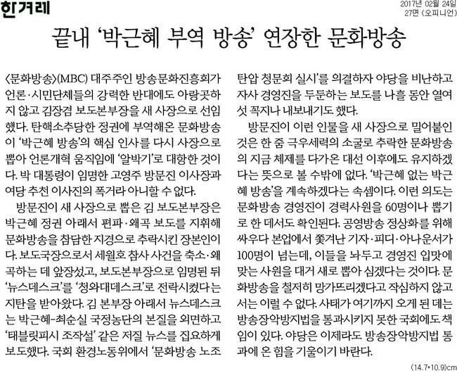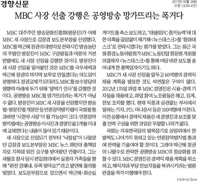 경향신문과 한겨레신문이 24일 김장겸 MBC 신임 사장 선임을 비판하는 사설을 냈다.