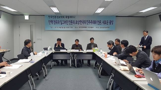 한국언론정보학회는 국정농단의 방관자이자 사실상 협력자였던 한국 언론을 되돌아보기 위해 3일 서울 중구 국가인권위원회 배움터에서 ‘탄핵 정국과 일그러진 언론의 초상’을 주제로 특별세미나를 열었다. 자리에 참석한 학계·언론계 관계자들은 박근혜 탄핵 국면으로 오기까지 언론이 어떤 식으로 민주주의를 파괴시켰는지 분석하고 토론했다.