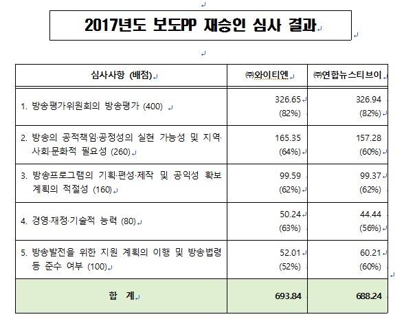 방송통신위원회는 지난 9일 전체회의를 열고 각각 오는 12일과 31일 승인 유효기간이 만료되는 YTN과 연합뉴스TV 등 2개 보도전문 방송채널사용사업자에 대해 재승인을 의결했다. 방통위는 "심사위원회의 심사결과 재승인 대상 2개 보도전문 방송채널사용사업자 모두 총 1000점 만점 중 재승인 기준 점수인 650점을 상회하였고 심사사항별 과락은 없어 재승인 기준을 충족하였다"고 밝혔다. 이들 각각의 평가점수는 YTN 693.84점, 연합뉴스TV 688.24점이다.