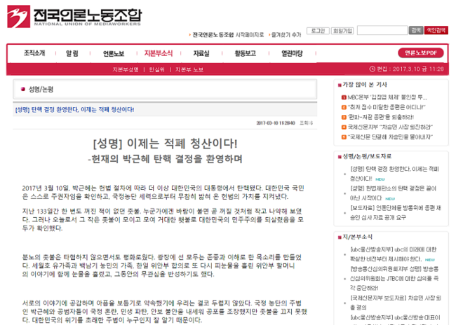 언론노조는 그러나 “박근혜 탄핵에도 불구하고 광장에 모인 수많은 이들은 촛불을 끌 수 없다. 지난 4년간 쌓인 적폐의 상처는 깊고, 아픔은 크기 때문”이라며 “이를 바로잡아야 우리는 다시 희망을 이야기할 수 있다. 박근혜와 모든 공범자, 부역자는 법의 준엄한 심판을 받아야 한다”고 했다.