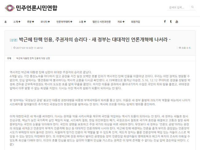 민주언론시민연합도 이날 성명을 내고 “박근혜 대통령 탄핵 심판이 위대한 주권자의 승리로 끝났다”고 밝혔다. 민언련은 “4개월 넘는 기간 풍찬노숙을 마다하지 않고 광장을 지킨 일천 오백만 촛불 민의가 역사적인 탄핵 인용을 이끌어낸 것”이라며 “4.19혁명으로 쫓겨난 이승만, 5.16, 12.12 쿠데타로 정권을 찬탈한 박정희·전두환 군부독재정권도 역사의 도도한 흐름 앞에 무릎을 꿇었다”고 했다.