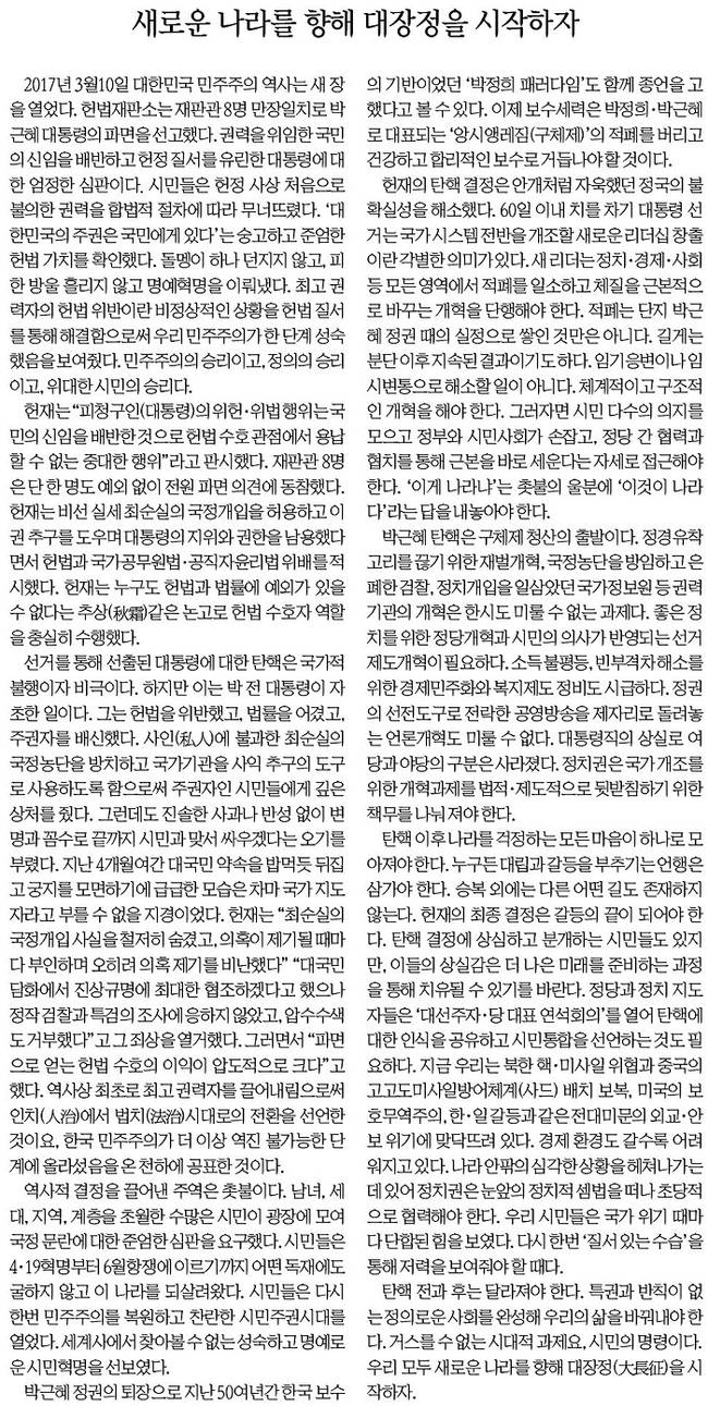 한겨레도 “헌재 결정은 탄핵 열차의 종착역이자 새로운 도전을 향한 출발역이다”이라며 “나라의 근간을 새롭게 세우는 일은 단지 법치주의의 확립, 최고권력자의 절제 등에 그치지 않는다. ‘헬조선’이라는 말로 대변되는 사회 전반의 부조리와 불평등, 사회 곳곳에서 난무하는 반칙과 특권, 정·관·재계의 강고한 기득권 체계 등 그동안 우리 사회에 켜켜이 쌓인 적폐 청산이 그것”이라고 강조했다.