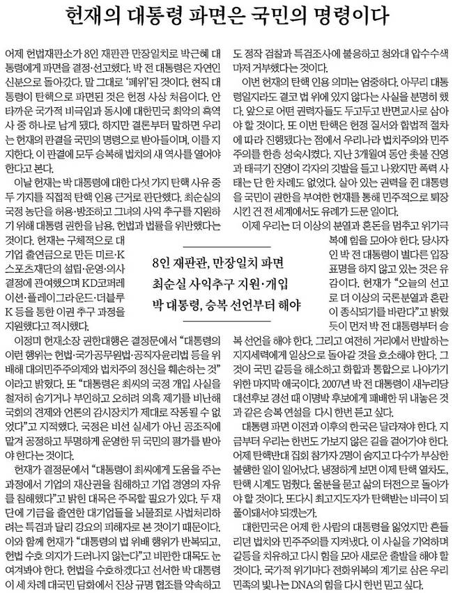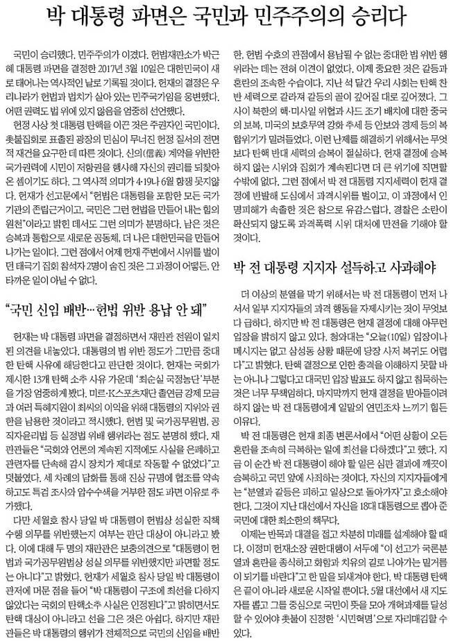 한겨레는 “박 대통령 파면의 외적 형식은 헌법재판소의 탄핵 인용이지만, 실제적 내용은 상식과 순리의 승리”라며 “이것은 좌우의 문제도, 진보와 보수의 대결도, 이념과 계급의 문제도 아니다. 겨우내 광장에 타오른 촛불은 ‘법치와 민주’를 향한 타는 목마름이었고, 헌재는 ‘전원일치 찬성 파면’으로 이에 응답했다”고 썼다.