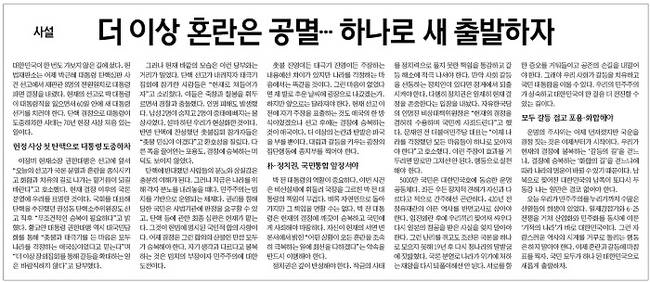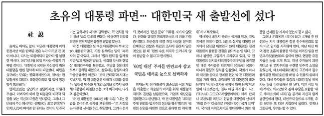 헌법재판소가 10일 재판관 8명 만장일치로 박근혜 대통령의 파면을 선고했다. 대한민국 역사에 남을 한 순간이었다. 언론사들 역시 사안의 중요성 때문인지 대부분 통단 사설을 통해 헌재의 결정과 관련한 사설을 실었다. 몇몇 신문은 1면과 2면에 사설을 배치하기도 했다.
