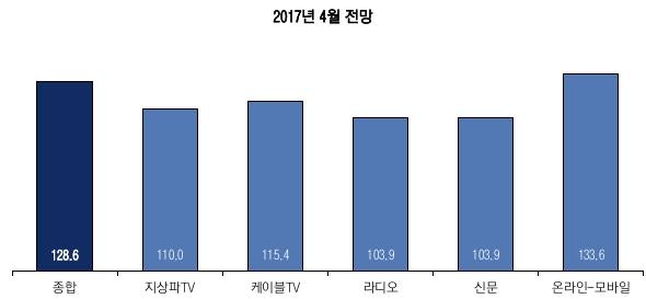 매체별 KAI지수를 보면 지상파TV 110.0, 케이블TV 115.4, 라디오 103.9, 신문 103.9, 온라인-모바일 133.6으로 집계됐다.