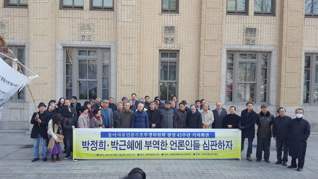 지난 1975년 유신체제에 맞서 싸우다 해직된 언론인들의 단체 ‘동아자유언론수호투쟁위원회’가 17일 정권에 부역한 이들을 향해 비판의 목소리를 높였다. 동아투위는 이날 서울 중구 동아일보사 사옥 앞에서 결성 42주년을 맞이해 기자회견을 열고 “박정희-박근혜 정부 아래에서 공영방송을 파괴하는 데 앞장선 부역자들을 가려내 심판대에 올리겠다”는 뜻을 밝혔다.