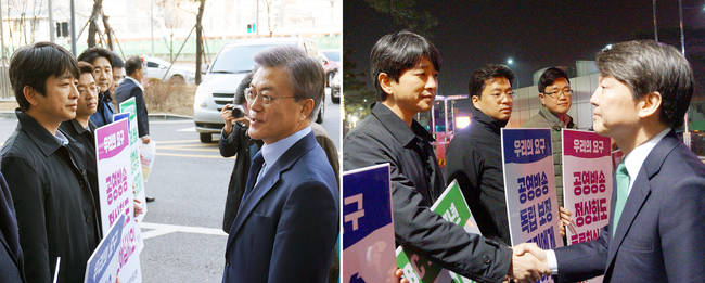 지난달 30일 오후 10시 서울 상암동 MBC 사옥 앞. 국민의당 경선 후보들이 하나둘 씩 모습을 드러냈다. MBC 토론프로그램 <100분 토론> 생방송에 참석하기 위해서다. 사옥 앞에서 대기 중이던 전국언론노조 MBC본부 집행부는 ‘공영방송 정상화와 해직언론인 복직’을 요구하며 구호를 외쳤다.