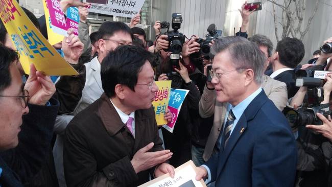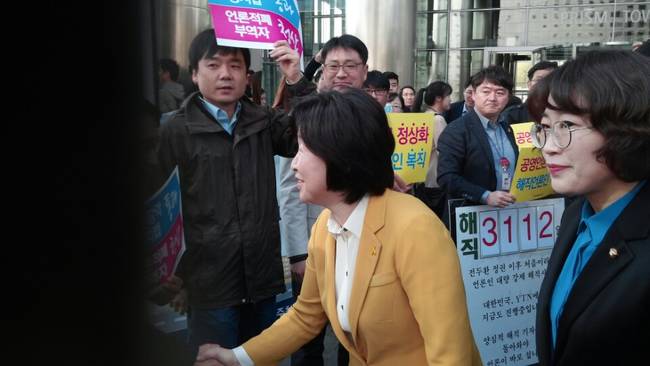 선전전 대열을 그냥 지나친 홍준표 자유한국당 후보를 제외하고 4명의 대선후보는 차량에서 내리자 조합원들과 악수를 나누며 잠시 김환균 위원장과 이야기를 나눴다. 김 위원장은 해직 언론인 복직과 공영언론 정상화 방안 등이 담긴 제19대 대선 미디어 정책 제안서를 전달하며 정책협약을 요청했다.