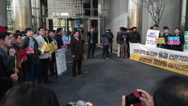 한국기자협회와 SBS가 공동주최하는 대선후보 합동토론회가 열린 13일 오전 상암동 SBS프리즘 타워 앞. 김환균 언론노조 위원장 등 언론노조 소속 조합원 50여명이 해직 언론인 복직과 공영언론 정상화 등을 요구하며 선전전을 벌였다.
