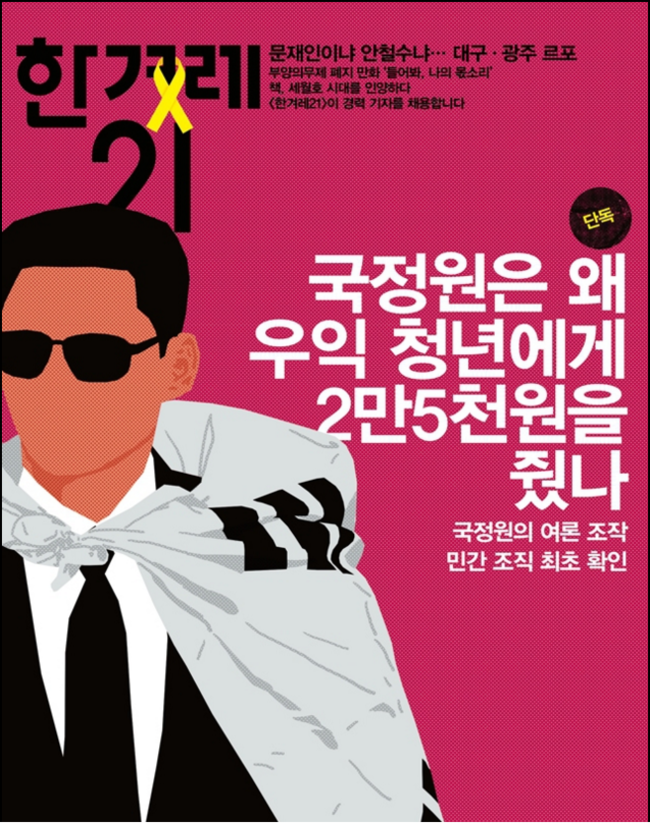 한겨레21 표지가 마감날인 지난 14일 오후 3시 바뀌었다. 태극기를 어깨에 두르고 선글라스를 낀 남자 옆에 ‘국정원은 왜 우익 청년에게 2만5천원을 줬나’라는 제목의 기사가 커버스토리가 됐다. 국정원이 운영한 정황이 짙은 민간 여론조작 조직 '알파팀'을 세상에 드러내는 기사였다. 원래 표지는 대선 특집7호로 심상정 정의당 대선후보의 사진과 차별금지법이 함께 다뤄질 예정이었다.