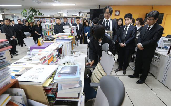 ‘예술을 사랑한 낭만적 글쟁이’ 손준현 기자의 장례가 25일 사우장으로 치러졌다. 이날 새벽 5시 빈소를 떠나 화장장을 거쳐 서울 공덕동 한겨레신문사에 도착한 고인의 유해는 편집국이 위치한 6~7층을 둘러본 후 3층 청암홀에 자리했다. 유가족을 비롯해 양상우 사장, 이제훈 편집국장 등 한겨레 임직원 300여명은 영결식에 참석해 고인이 영원한 안식을 취할 수 있기를 빌었다.